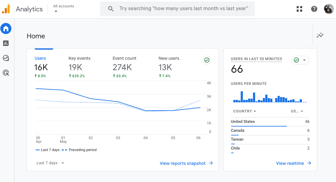 Explored various views including HOME, REPORTS, EXPLORE, and ADVERTISING in the GA4 Analytics interface.