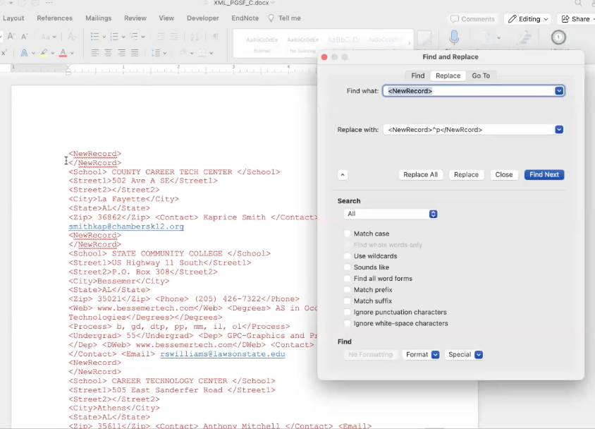 Leveraged Microsoft Word's wildcard tool to format XML data from the published directory