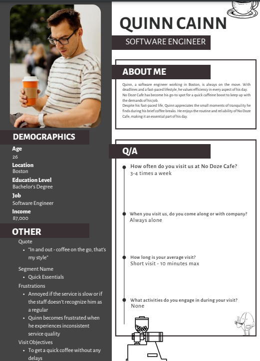 Crafted quotes summarizing each persona's perspective on their coffee shop experience.