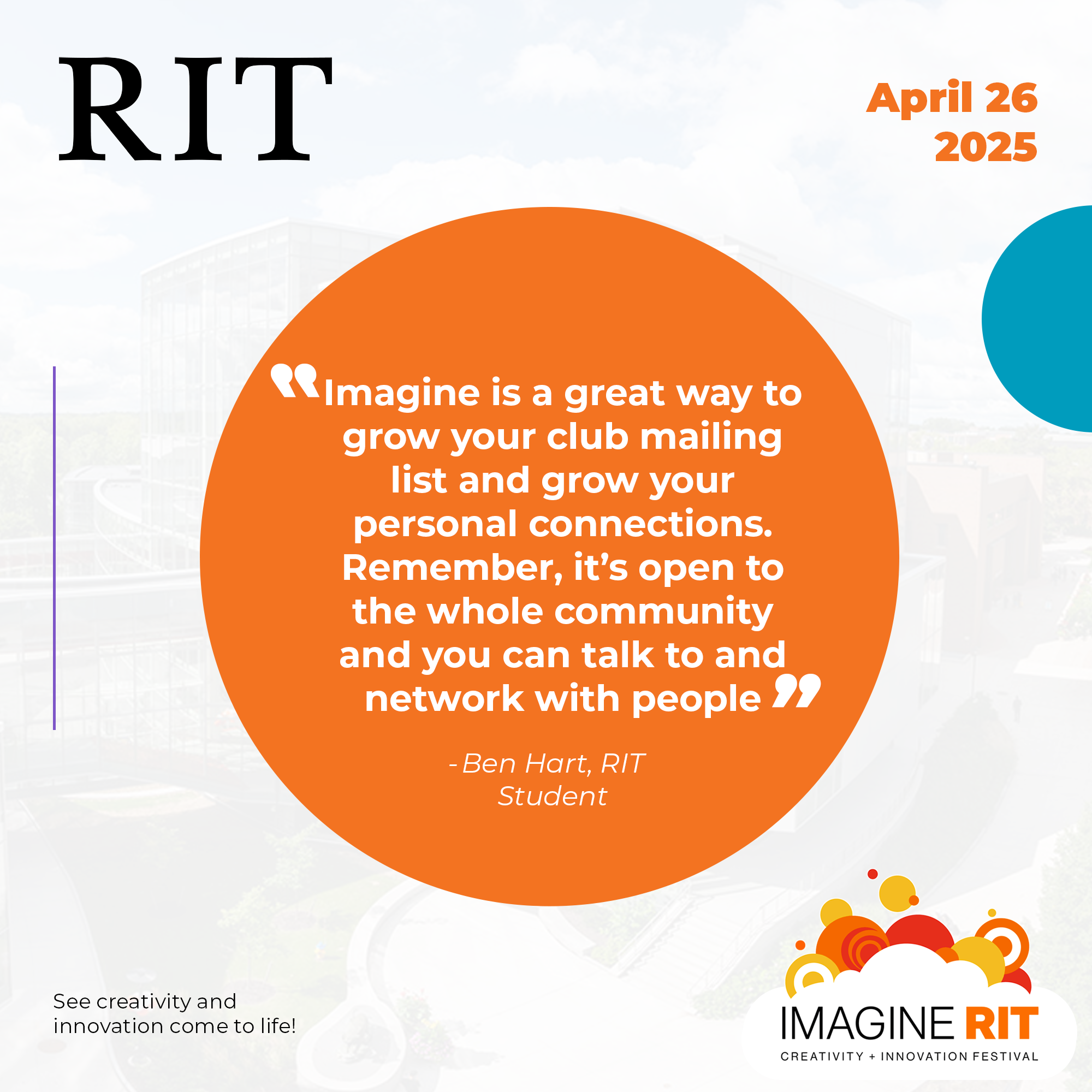 As both a lead designer and student voice behind the campaign, I brought a dual perspective to the Imagine RIT brand. I supported the social media strategy by designing visually engaging content that showcased student innovation, promoted event awareness, and connected the RIT community through bold, on-brand visuals across Instagram, LinkedIn, and campus platforms.