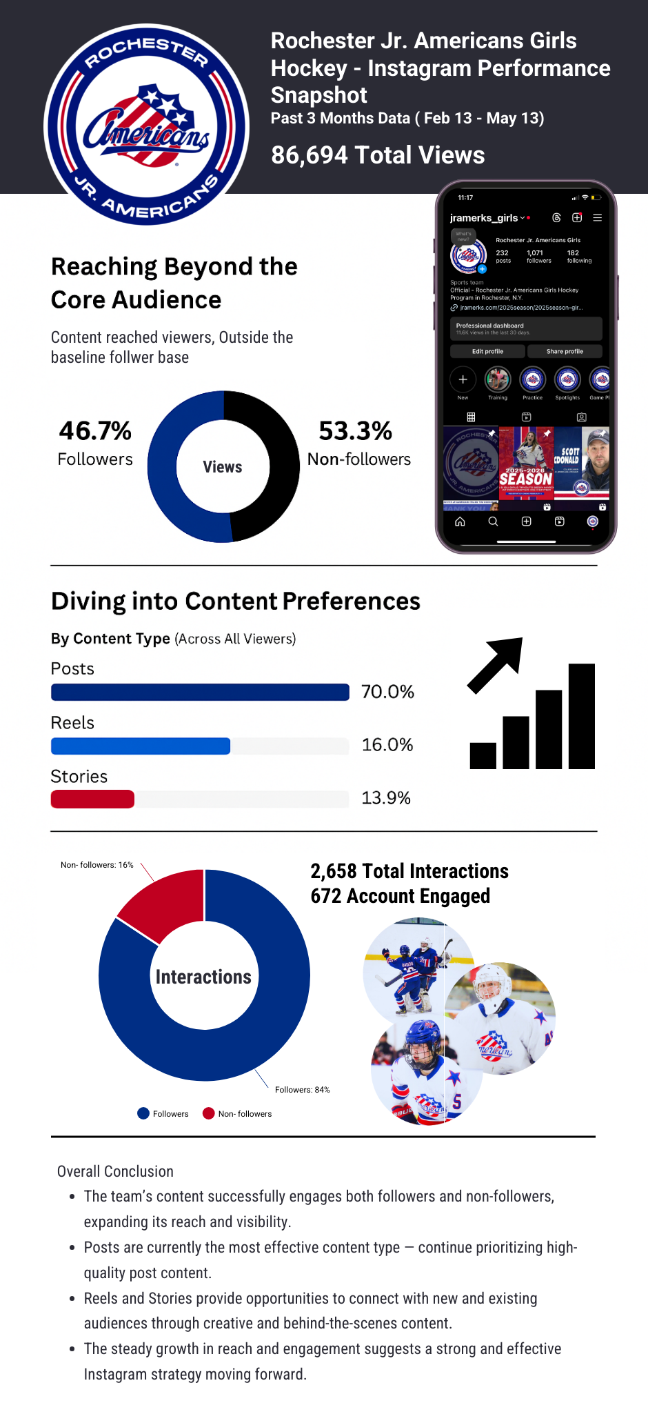As a social media content creator with Technically Speaking, a student-run, faculty-led Advertising and Public Relations agency, I worked with clients like the Jr. Amerks to elevate their brand presence. I managed the Jr. Amerks' Instagram account, combining strategic planning with creative execution to showcase players, engage fans, and foster team culture through dynamic visual content.